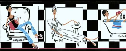 Wallpaper border features framed images of girls being pampered at a spa and in a bathtub. Background is a black and white check pattern. Top and bottom trim are black.
