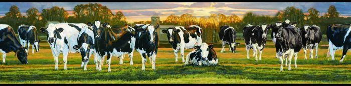 Chesapeake FFR65382B Wallpaper Border. This border features luscious hues of green, yellow, a blazing blue sky, and an ethereal sunset. The black and white milk cows in the foreground have shimmering coats and a serene spirit.