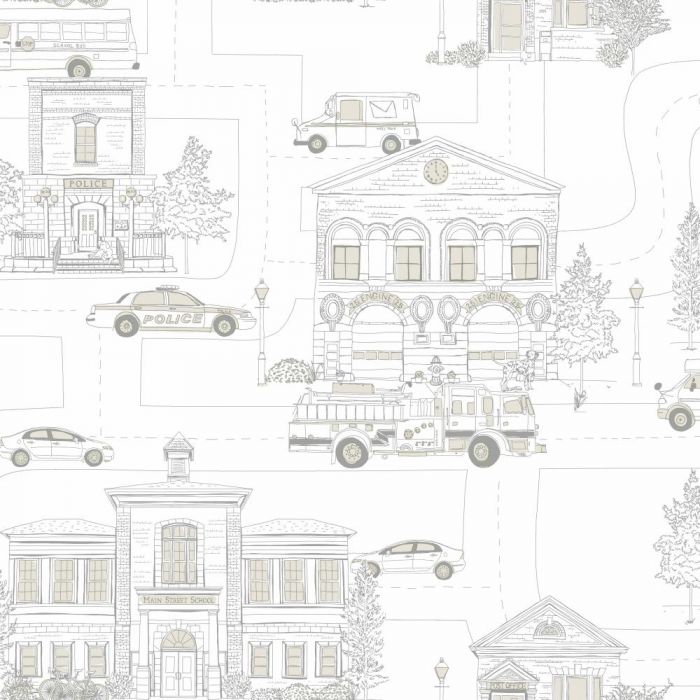This fun pattern depicting all types of transportation vehicles traveling along a pencil sketch street map of a typical American towns Main Street. Delightful graphic renderings of all the vehicles boys love include fire engines, police cars and dump trucks moving within an architectural sketch backdrop of a typical towns homes and businesses done in tonal shades of sky blue, white or almond. Use it alone or with Small Main Street Border, Large Main Street Border and Wide Multi Stripe. Made in the USA.