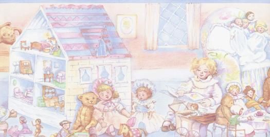 Wallpaper border has dollhouses, rocking horses, dolls, books and Teddy bears in a playroom setting with light blue trim.