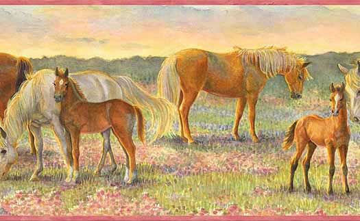Wallpaper border features horses in a field with pink flowers. Top and bottom trim are pink.