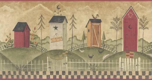 Wallpaper border has six different outhouses on olive green rolling hills with hens, rabbits, birds, and a white iron fence. Border has burgundy and checkered trim.