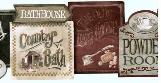 Wallpaper border features bathroom signs in burgundy, beige, tan, and black. Top and bottom trim is die cut/laser.