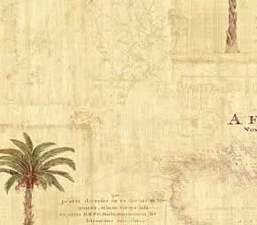 Wallpaper features green and mauve palm trees. Background is beige with an old world map design.