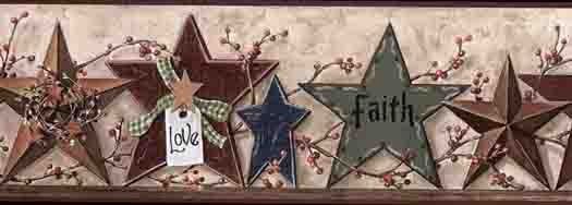 Wallpaper border features stars in green, burgundy, blue and mustard. Stars have faith, family and friends on them. Background is tan with burgundy top and bottom trim.