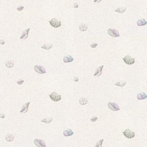 Wallpaper has pastel seashells on a white background with silver specks.