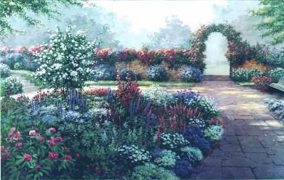 Wallpaper mural has a stone walkway, stairs, a bench, and an archway with blue, white, and mauve flowers and greenery. Each mural has 8 panels measuring 49 1/2 es x 41 es each.