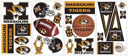 Appliques feature the University of Missouri mascot, logo, basketballs, baseballs, and footballs.