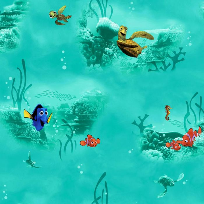 | Material | Deep in the ocean youll find Nemo, his friends and family. The brightly colored sea life swims among the coral in a beautiful Aqua water world. Delight your young oceanographer with this Disney wallpaper for the bedroom. Add the Nemo Under Water Border |